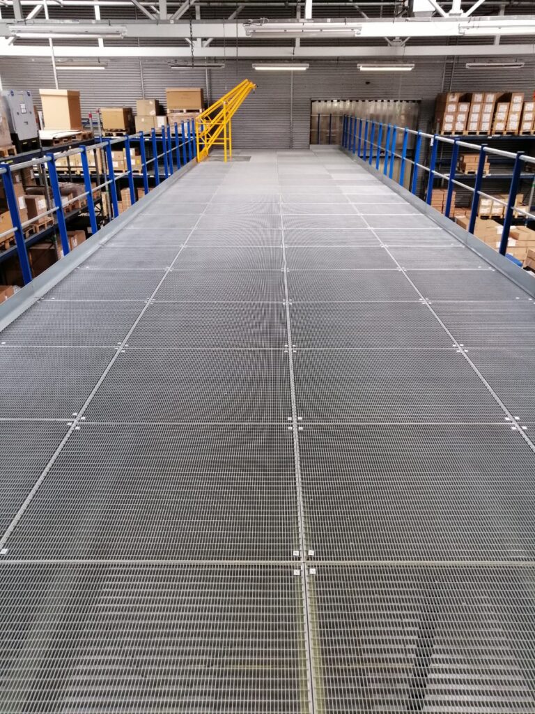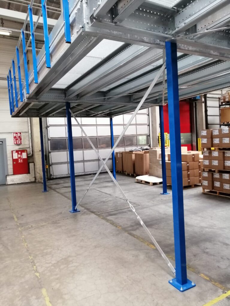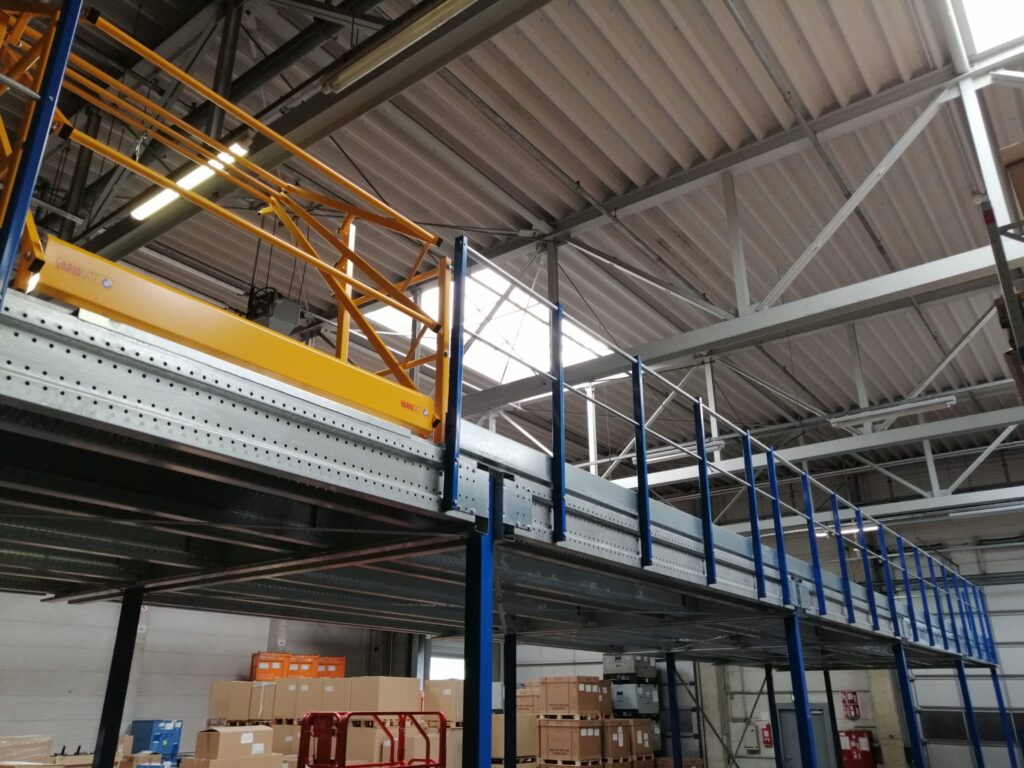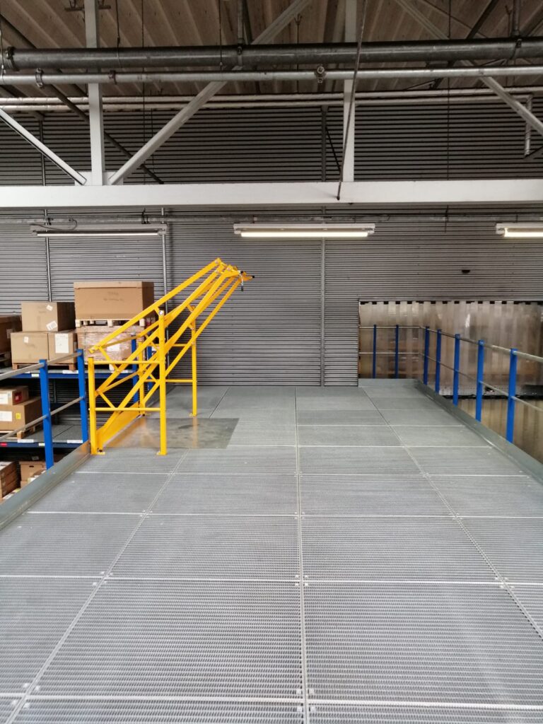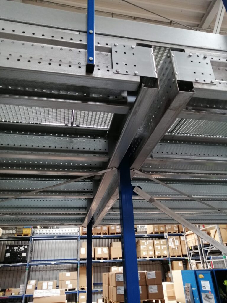 Le plancher mezzanine a été construit avec des profils laminés à froid et une trame de colonnes d’environ 5 000 x 3 500 mm, équipé d’un plancher caillebotis. Avec une hauteur de +3 400 mm et une stabilité assurée par des croisillons et des portiques, la structure est solide et sûre. Cette configuration permet de stocker les pièces de manière ordonnée et de les garder facilement accessibles.