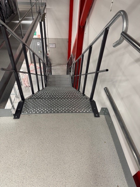 Le plancher mezzanine, d’une hauteur de +4 148 mm, est stabilisé par des portiques, des contreventements en croix et des cadres de rayonnage. Cette configuration garantit une rigidité et une adaptabilité maximales à l’intérieur de l’entrepôt. Conçu pour le stockage et le picking, il optimise la rapidité, l’accessibilité et la fluidité du travail tout en exploitant pleinement la hauteur disponible.