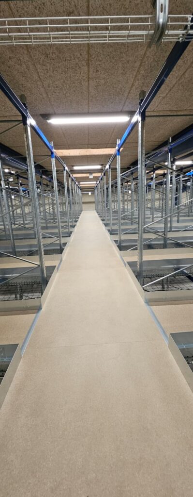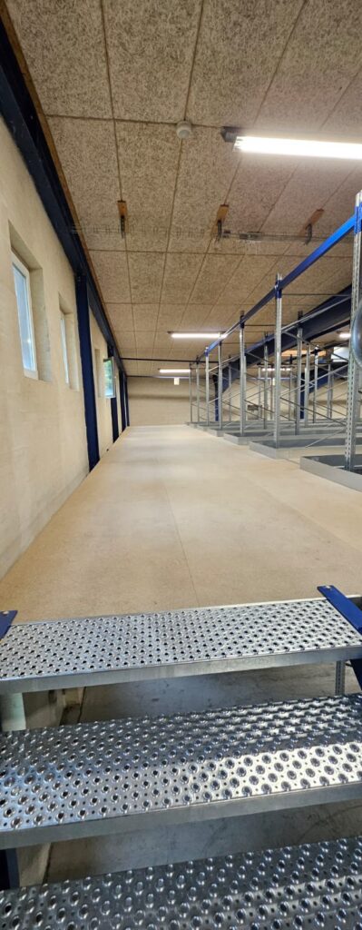 Le plancher mezzanine a été combiné avec des rayonnages à palettes, permettant à la fois le stockage en vrac et un picking efficace. Avec une hauteur de plancher de +2 883 mm et une stabilité assurée par des portiques et des cadres de rayonnages, la construction est adaptée à un usage intensif. Cette combinaison exploite au mieux la hauteur disponible et assure un entrepôt flexible et évolutif.