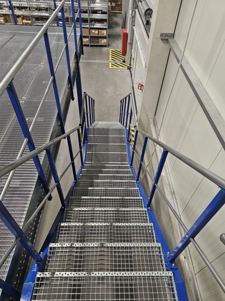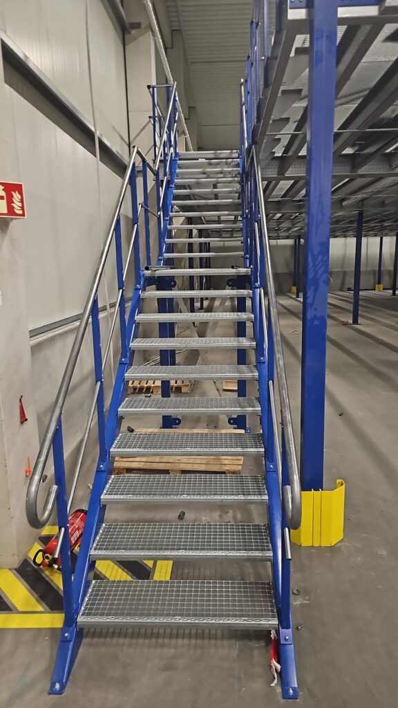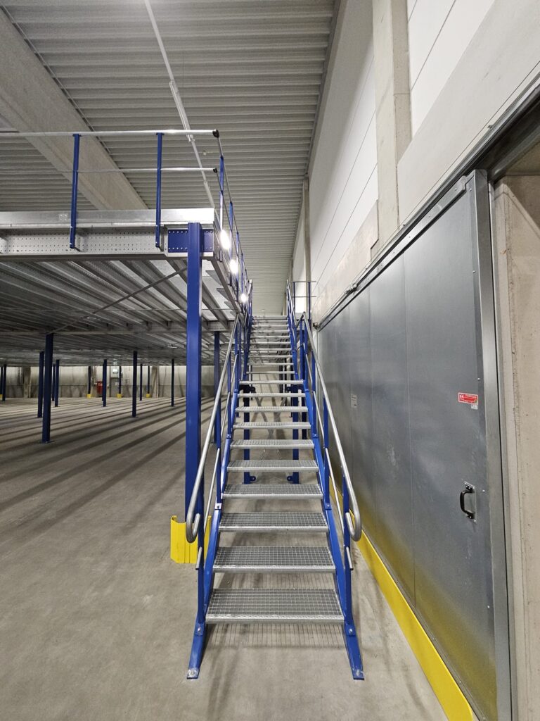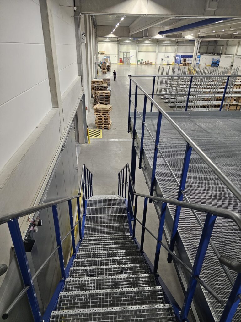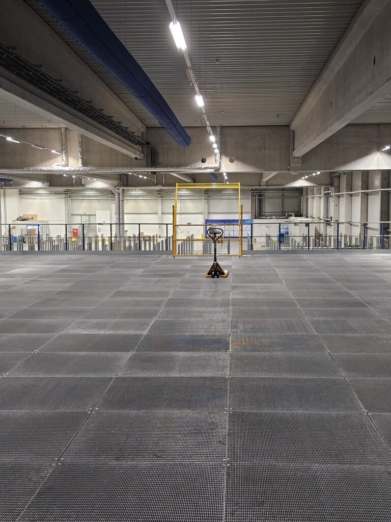 Installé à +3 700 mm et stabilisé par des contreventements en croix, le plancher mezzanine garantit une sécurité et une durabilité maximales. Le plancher en caillebotis assure une excellente circulation de l’air, indispensable pour les environnements logistiques médicaux. Conçu pour le stockage et le picking, il associe solidité, fonctionnalité et facilité d’entretien.