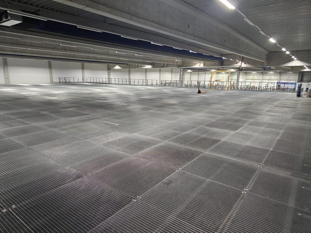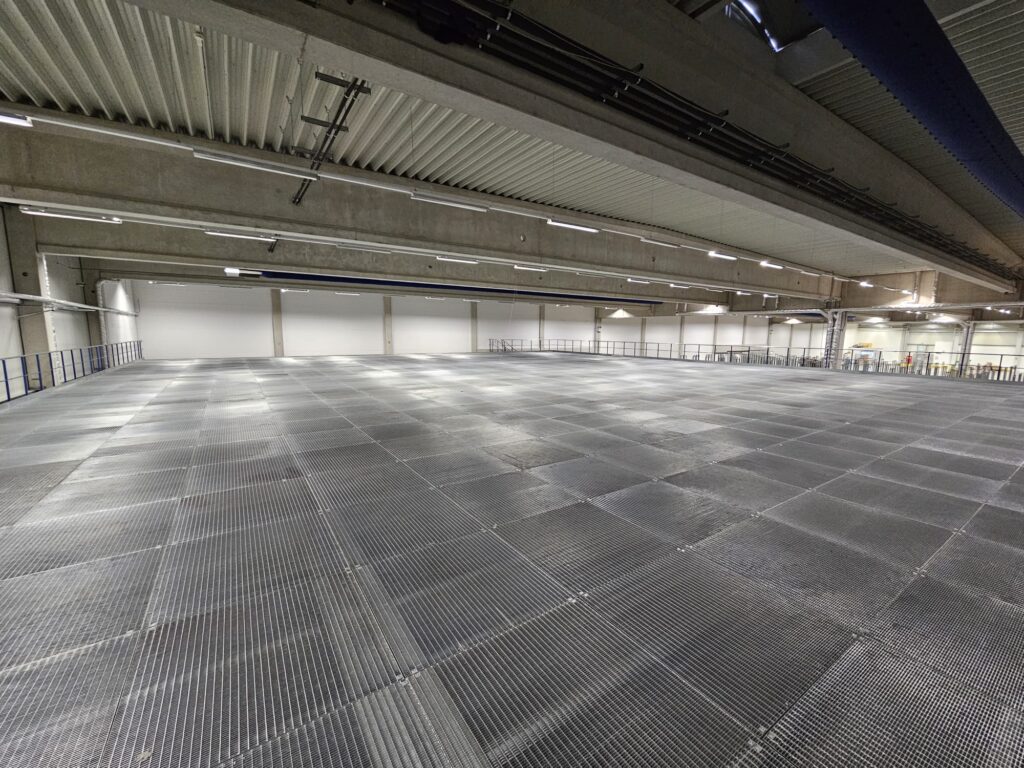 Pour Frigo-Trans GmbH à Fußgönheim, Nolte Mezzanine a conçu et réalisé un plancher mezzanine d’un seul niveau d’une surface totale de 2 000 m². La structure est composée de profils en acier formés à froid avec une trame de colonnes d’environ 6 150 x 5 500 mm et d’un plancher en caillebotis métallique. Ce système robuste combine résistance, ventilation et accessibilité, parfaitement adapté à la logistique médicale.