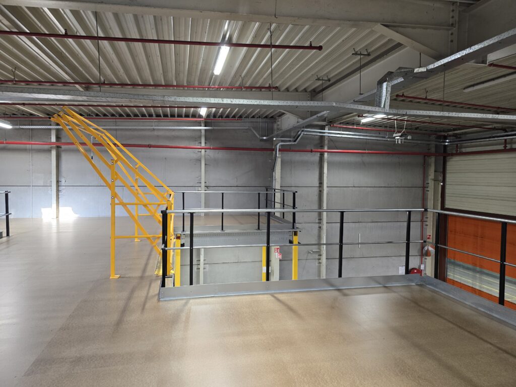 Le plancher mezzanine a été construit avec des profils laminés à froid et une trame de colonnes d’environ 5 300 x 5 000 mm, avec un revêtement en panneaux de particules. Avec une hauteur de +4 200 mm et une stabilité assurée par des portiques, la construction offre une base solide pour le stockage et le picking. Cette solution rend l’entrepôt non seulement plus efficace, mais aussi mieux préparé pour une future extension.